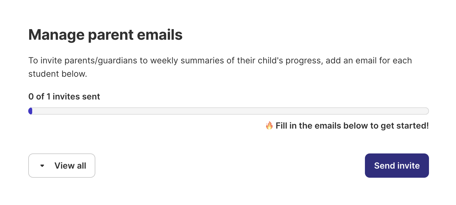 TIP: To get a better parent/guardian “subscribe” rate, we recommend personally notifying the parents/guardians in your class before you send the invites. Giving the parents/guardians this notice that you’ll be sending them an invite to subscribe to their child’s weekly progress reports will make it more likely that they see and open the invite email.