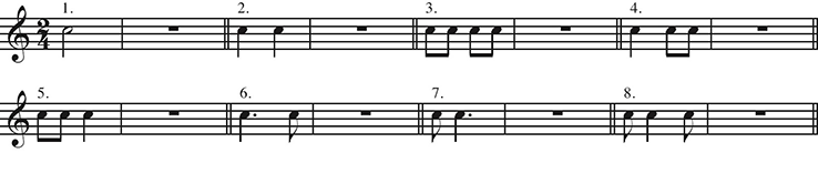 Spelling out the letters of words is similar to counting, “1+2+…” through a rhythmic phrase. Let’s develop a spelling list of short “rhythm words,” and begin to commit these “words” to memory. Have your students workout with the following two-beat “rhythm words.” How?